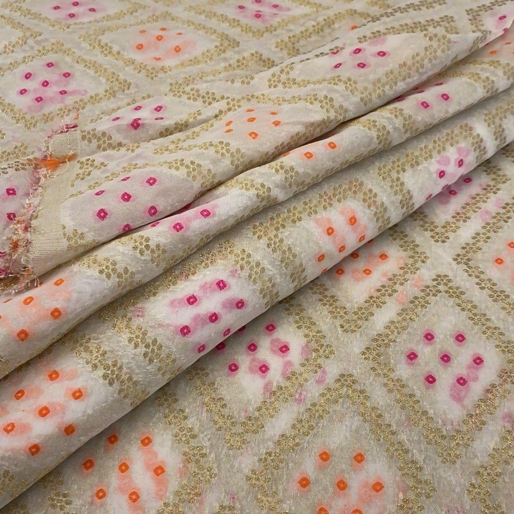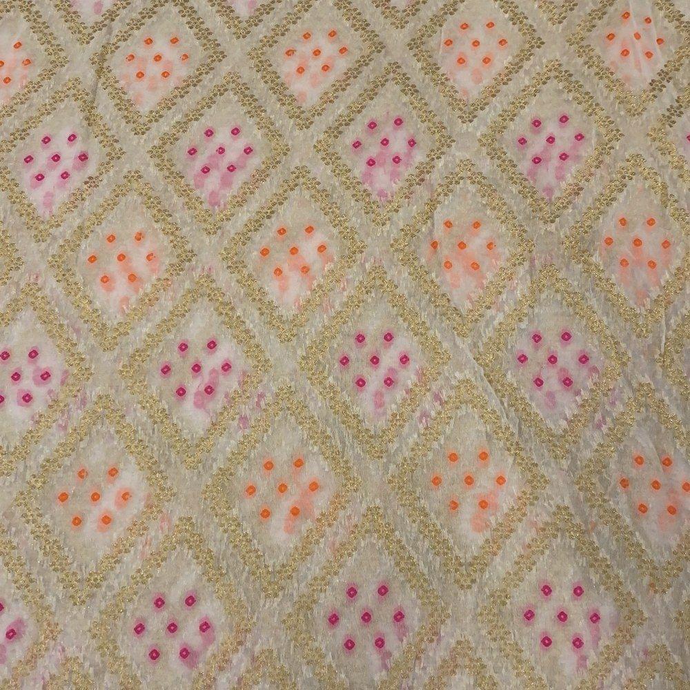 White Colour Georgette Jacquard Jaal, SKU: 100205856 Dyeable georgette jacquard in geometric pattern with pop colour detailing is an excellent fabric for lehengas, shararas and sarees as well.