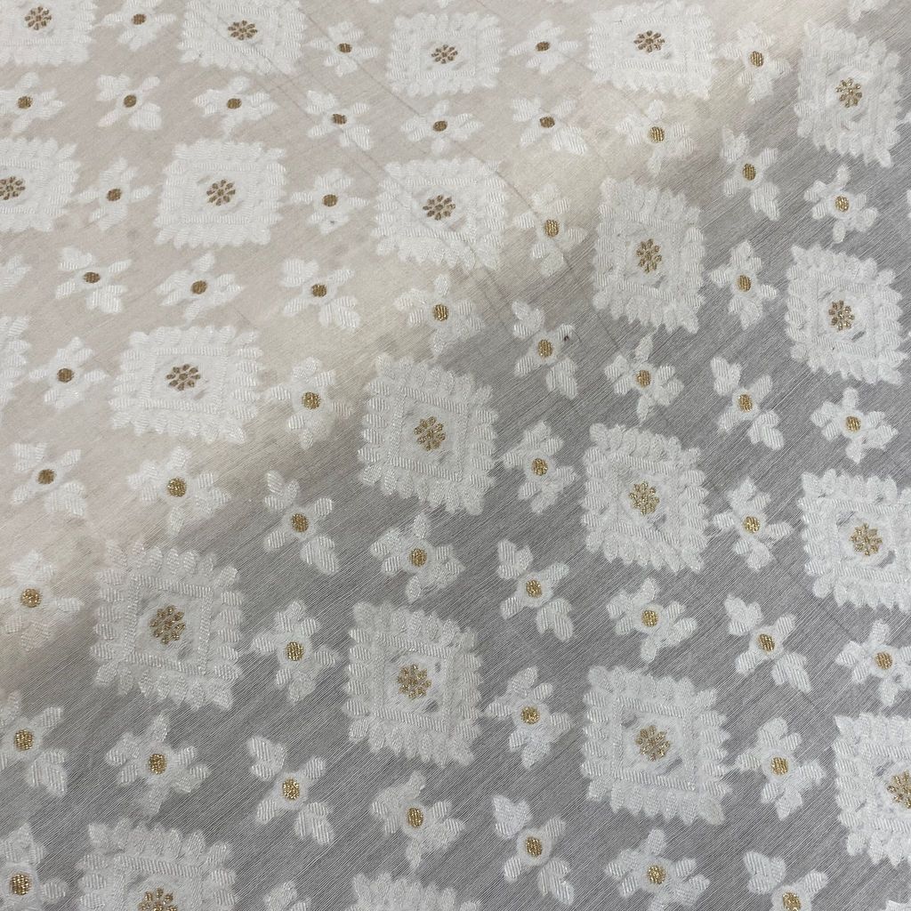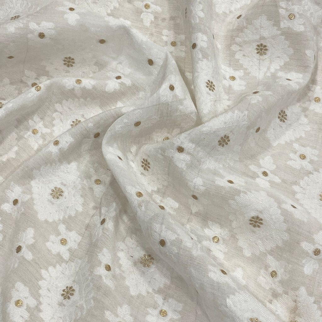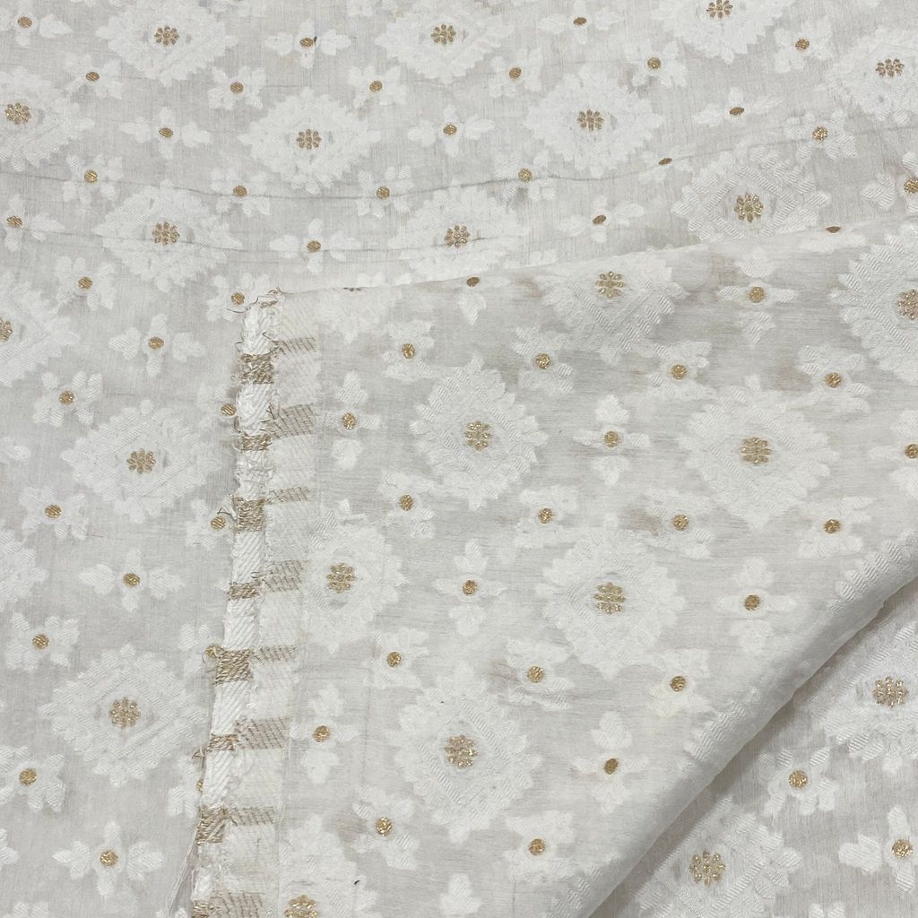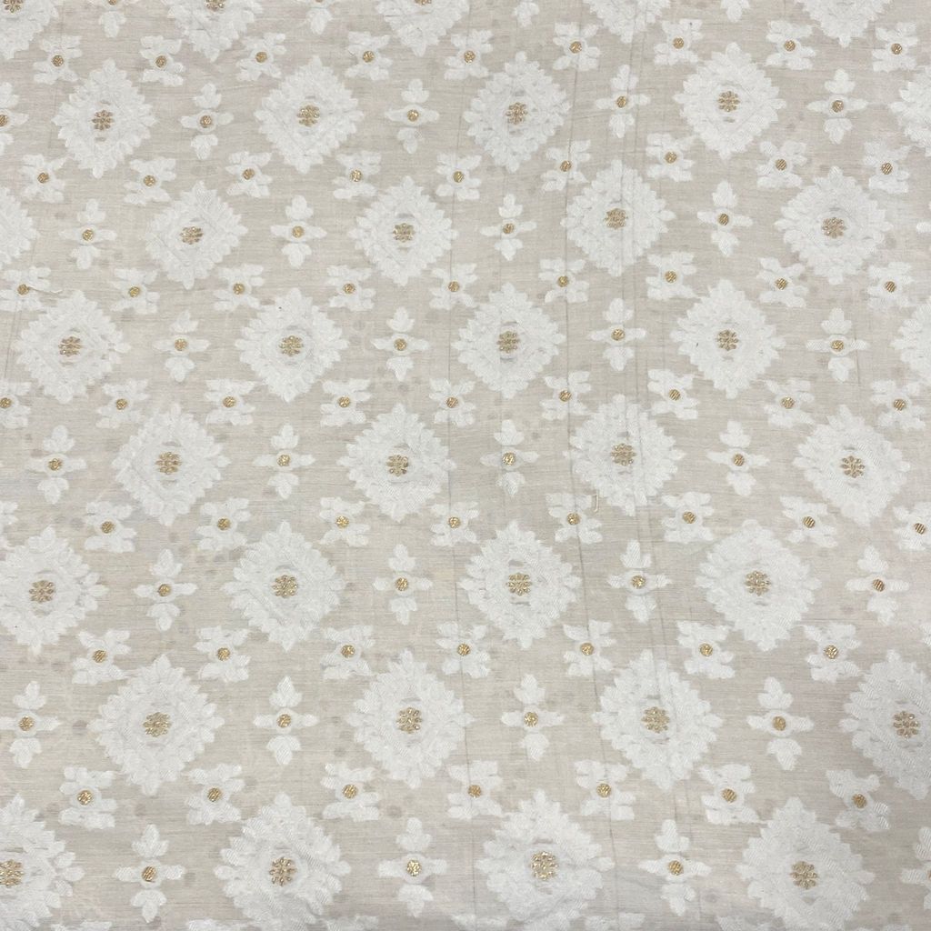 White Dyeable Muslin Jacquard, This dyeable muslin jacquard is good for kurtas, lehengas, skirts and salwar kameez as well. Set your imagination running and get this beauty in your wardrobe. This unisexsual Fabric is perfect for Summers and can be dyed in pastel as well as dark colours easily. SKU: 100232250
