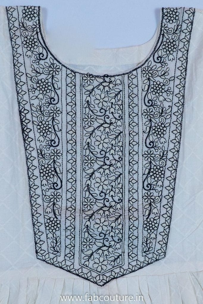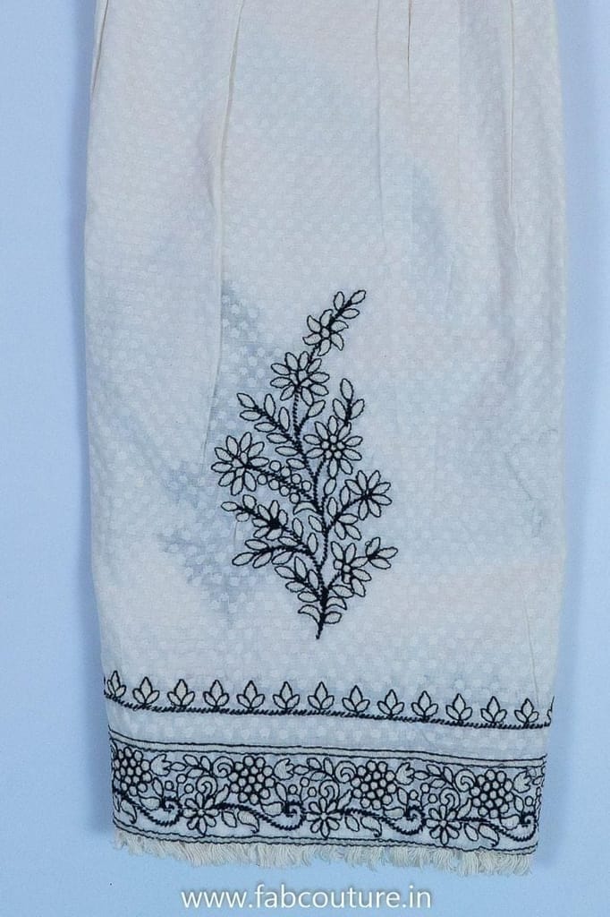 White Cotton Embroidered Suit With Cotton Plazzo And Muslin Dupatta. This comes from FabCouture Stitched Suits Collection and the fabric is pure cotton dobby which is thread embroidered on the neckline and the plazzo. The dupatta has a pretty border and tassel details. IT can fit upto size XL. SKU: 100211448