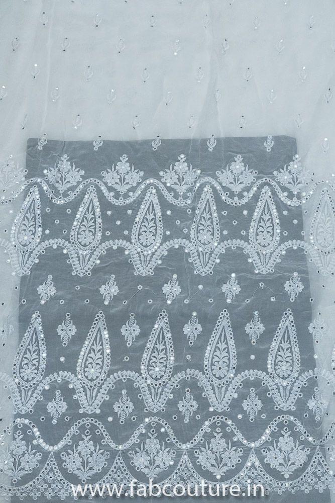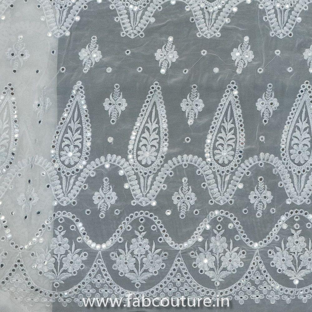 White Dyeable Faux Mirror Embroidery Fabric. This fabric with heavy paisley style embroidery on the daman and scattered on the top will make a good fabric for lehengas and anarkalis, kurtas, plazzos and shararas alike. It is flowy, sheer and can be dyed in any colour of your choice. , SKU:100201875