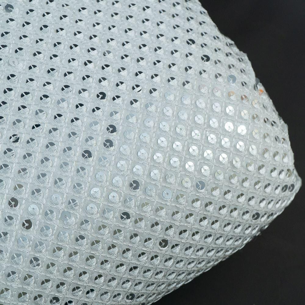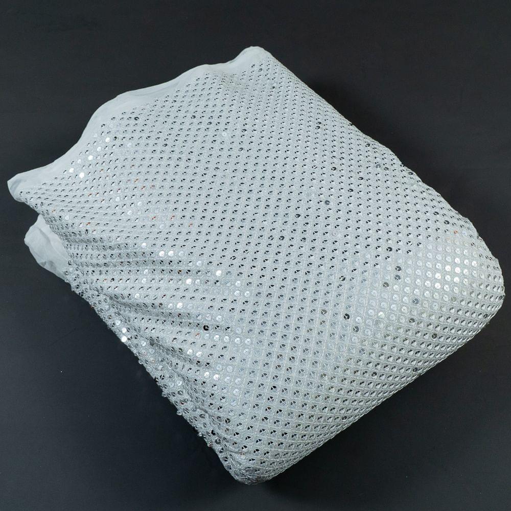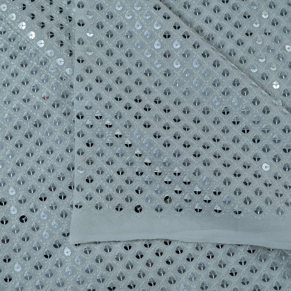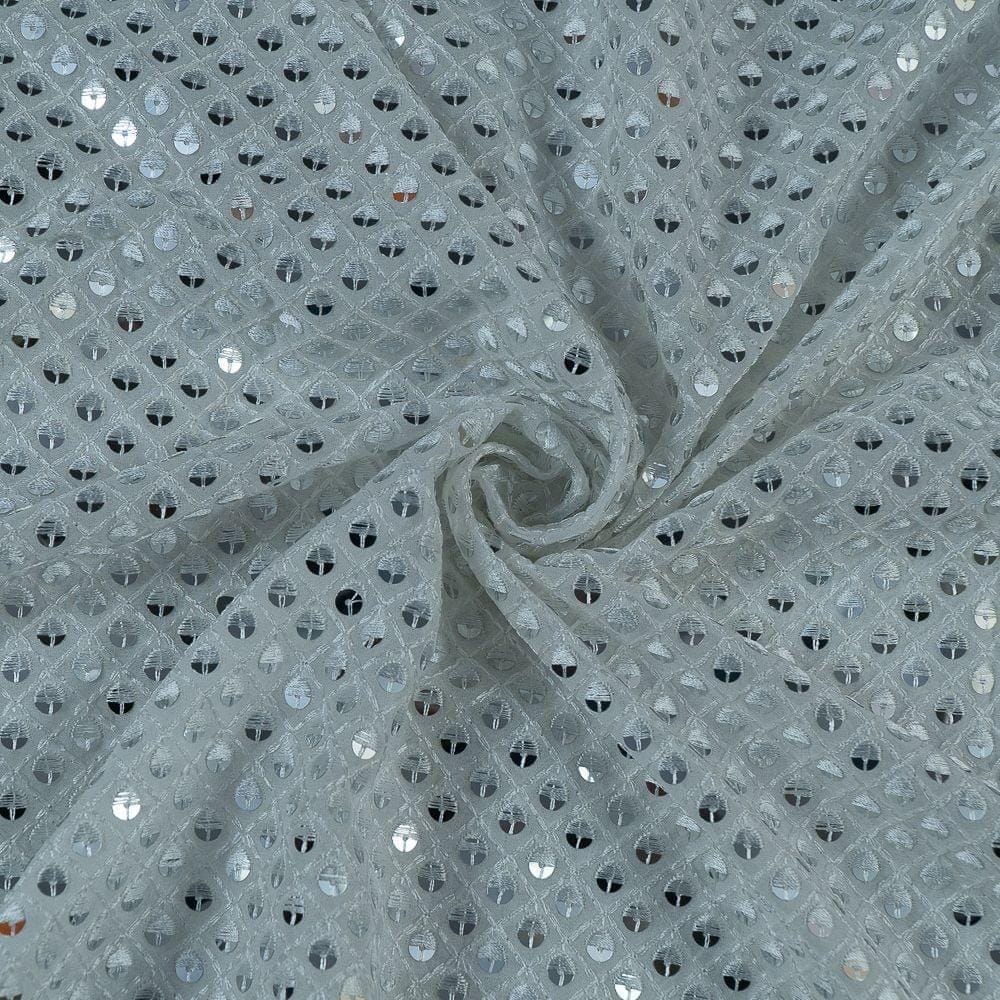 White Colour Dyeable Georgette Faux Mirror With Thread Embroidery. This dyeable faux mirror with thread embroidery on georgette which makes it blingi and good for party wear, is a good fabric for blouses, sarees, lehengas, sherwani and men n women kurtas. SKU:100227891 GEO EMB D.NO 332337
