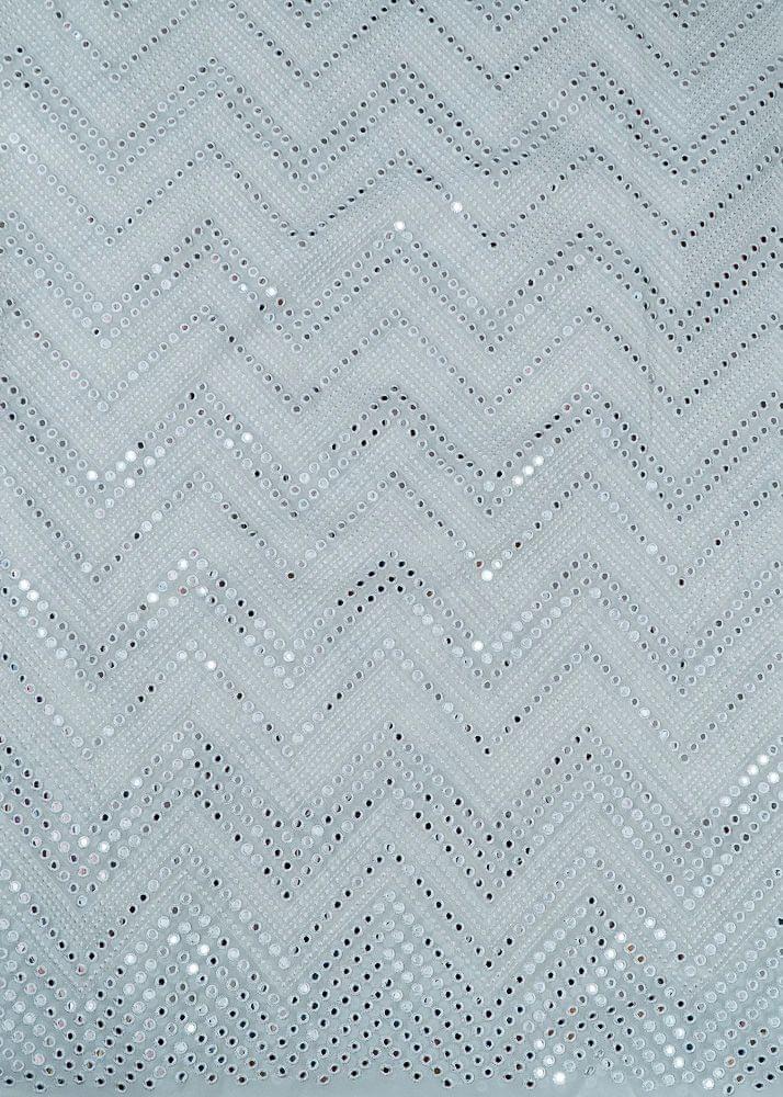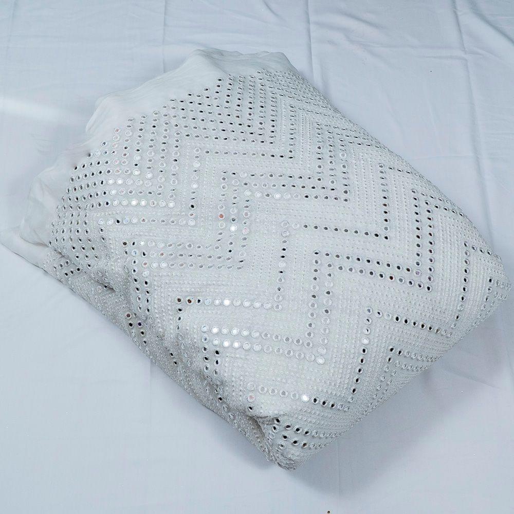 White Colour Dyeable Georgette Faux Mirror With Thread Embroideryin zig zag Pattern,This dyeable faux mirror with thread embroidery on georgette is a good fabric for blouses, sarees, lehengas, sherwani and men n women kurtas. SKU:10023654 D.No.55147