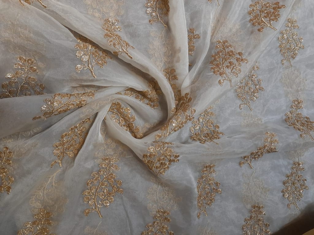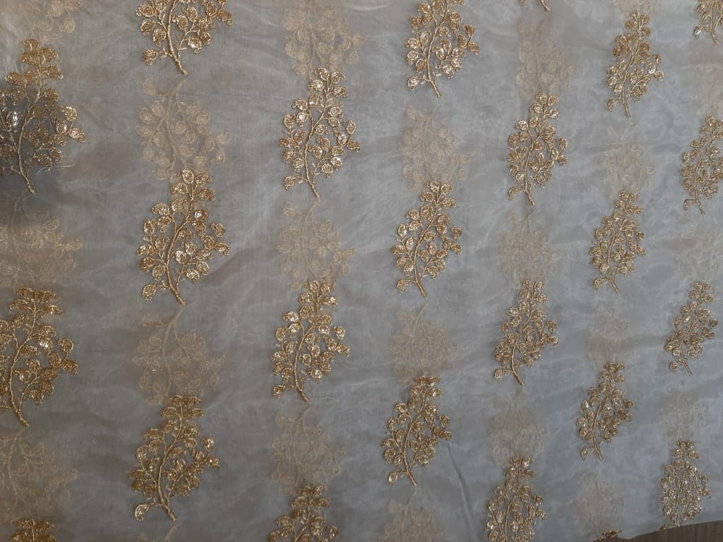 Fabric width 55" and embroidery with is 46" Its a Dyeable Organza Embroidery, Sheer Fabric with beautiful thread and Golden Sequin Work on it. Can be used to make dresses, Anarkalies and Lenghas. SKU:100185150