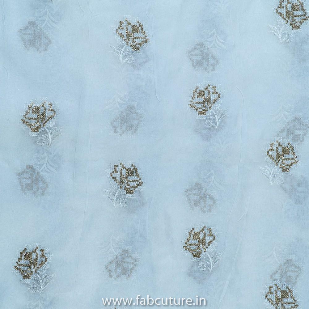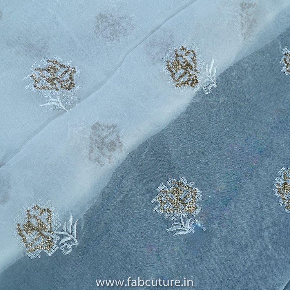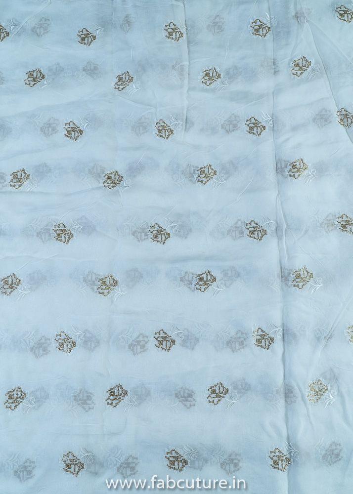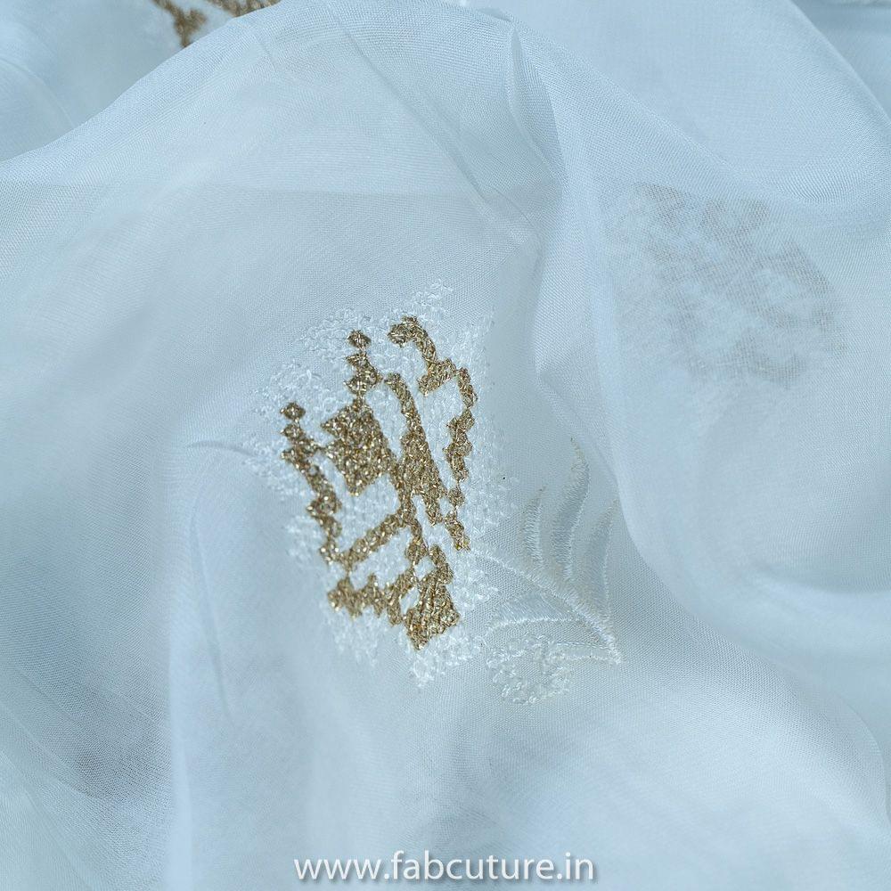 Viscose White Dyeable Organza fabric, smooth, silky, and shiny fabric. With Booties all over embroidered with zari and thread. SKU:100215638 ORGANZA EMB D.NO 45065