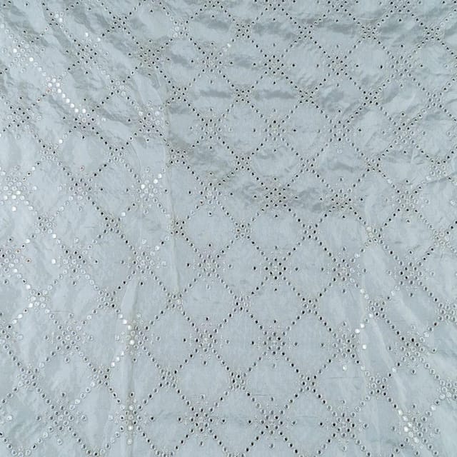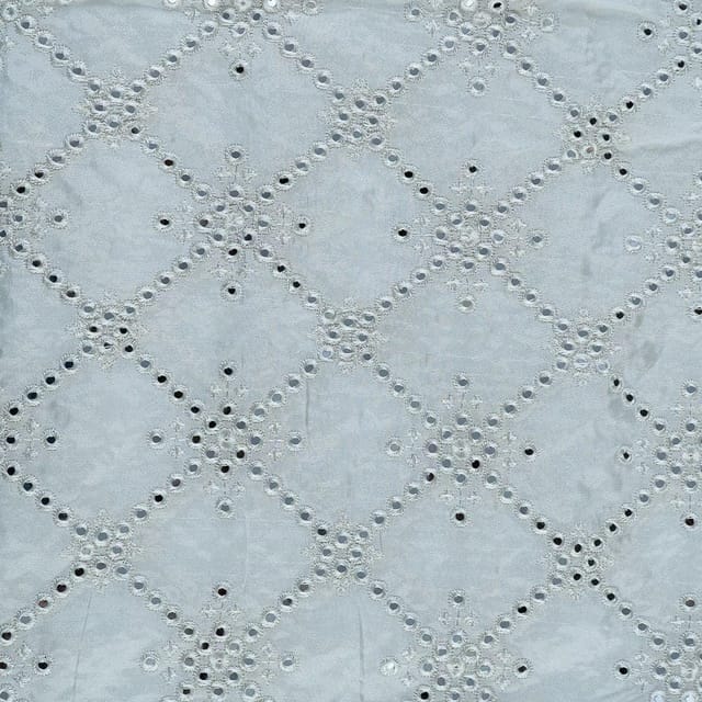 White Colour Dyeable Uppada Silk Faux Mirror With Thread Embroideryin Geomatric Pattern,This dyeable faux mirror with thread embroidery on georgette is a good fabric for blouses, sarees, lehengas, sherwani and men n women kurtas. SKU:10022279 Uppada EMB D.NO 185-5755