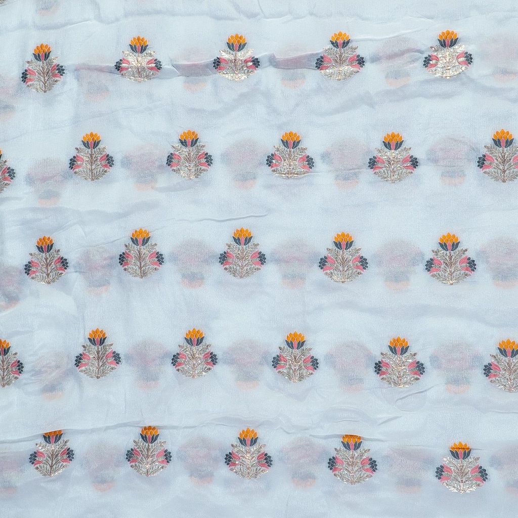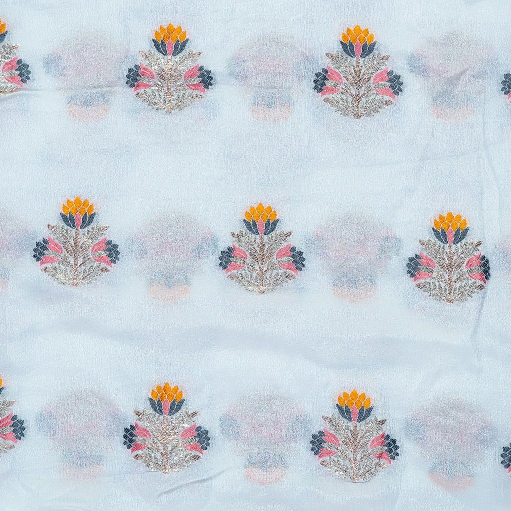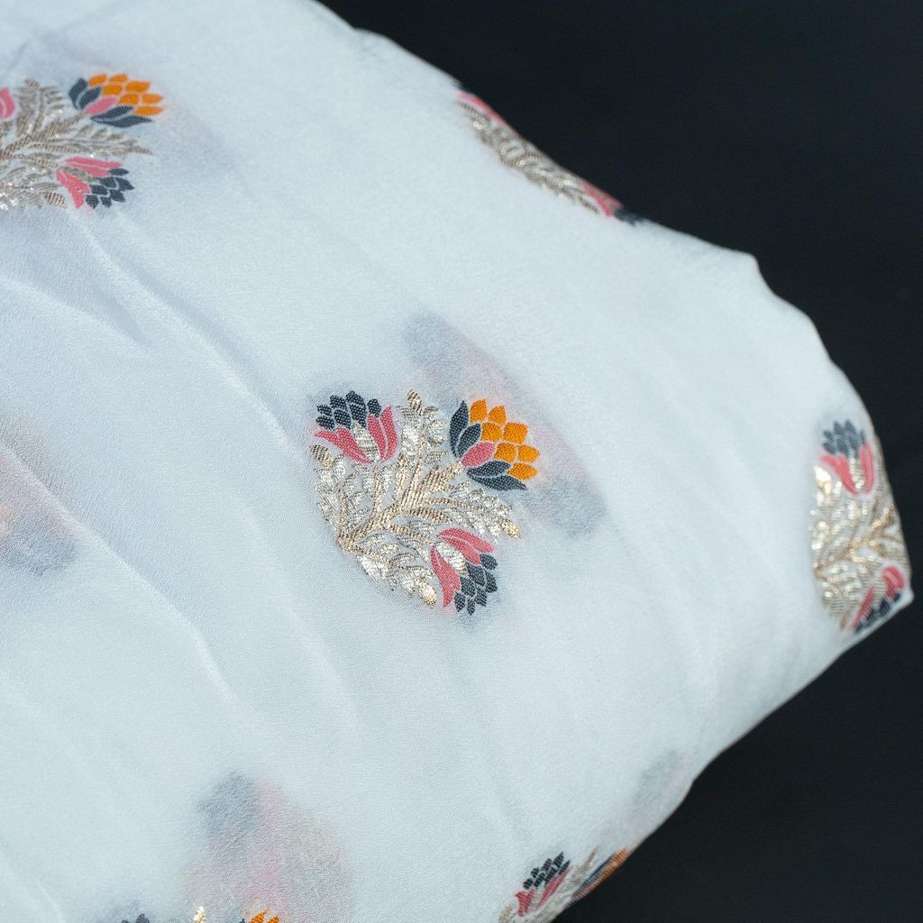 White dyeable Chinon chiffon Jacquard Booti with yellow, grey and pink meena and golden zari design which makes it very unique and different. This can dyed any dark, light or pastel shades and can be used in making skirts, tops, kurtas, sarees, dupatas and anrkalies. You can also combine them with matching fabrics to create your own look. SKU:10022234