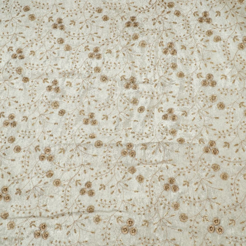 The pristine white base is dyeable, allowing you to customize the colour to suit your design needs. Adorned with an intricate golden zari and sequin jaal pattern, this fabric showcases an enchanting interplay of shimmer and craftsmanship. The delicate embroidery lends a regal charm, making it an ideal choice for bridal wear, festive ensembles, and evening gowns.