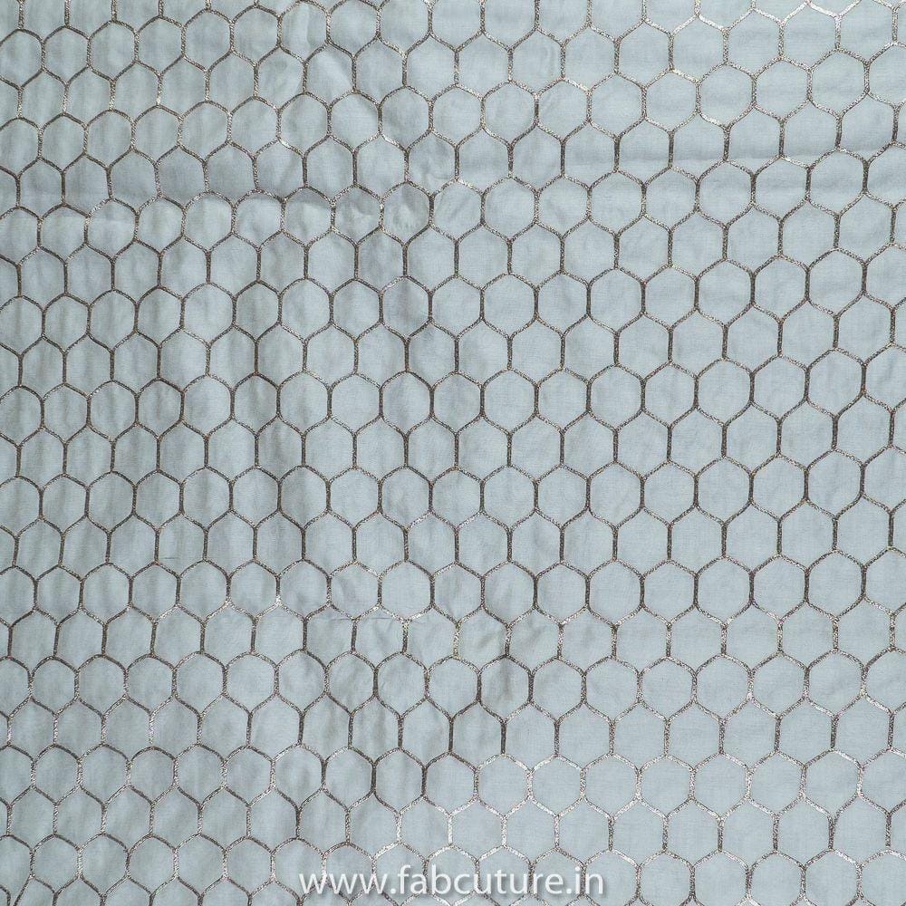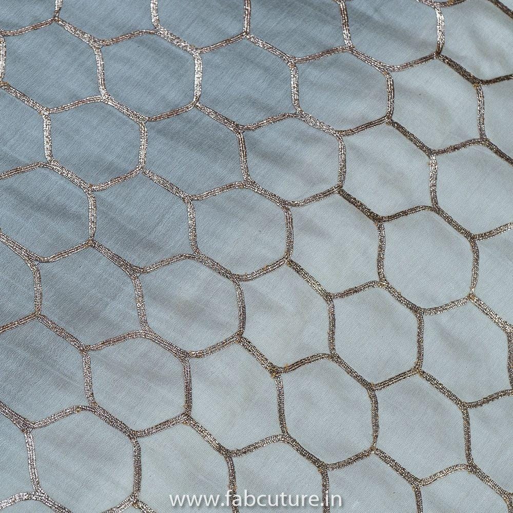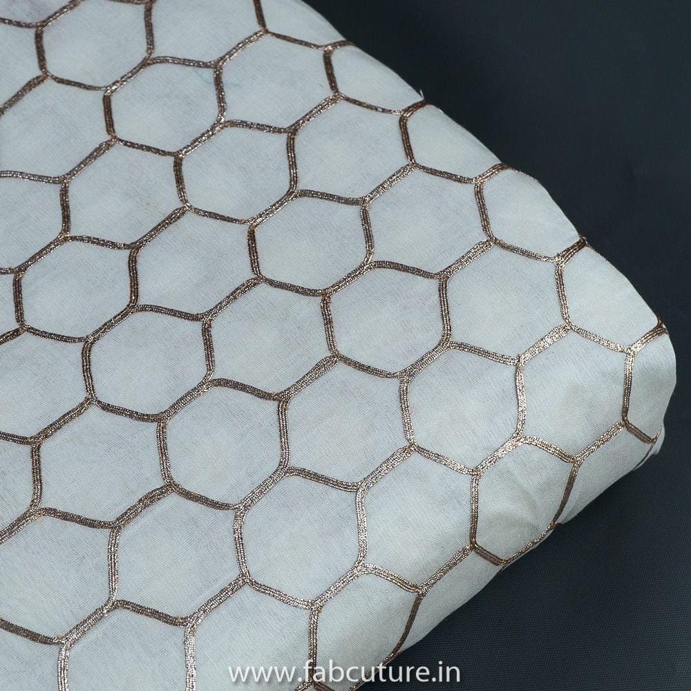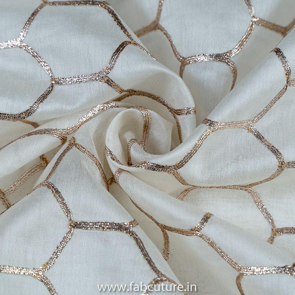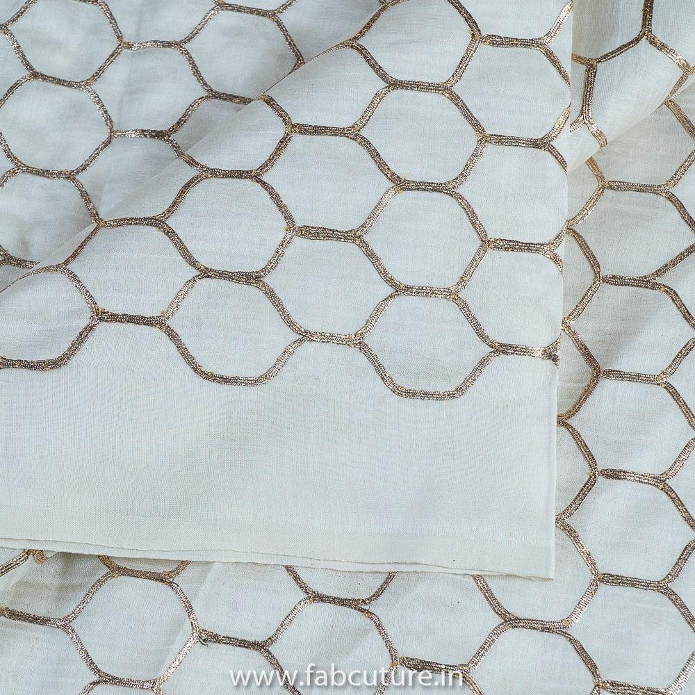 White Pure Banarsi Chanderi Embroidery Fabric With Golden Gota honey comb Patern, Can Used for making lehengas-choli, shirts, salwar-kameez, Tops, this fabric is fabulous for all, it s a dyeable fabirc. SKU:100215980