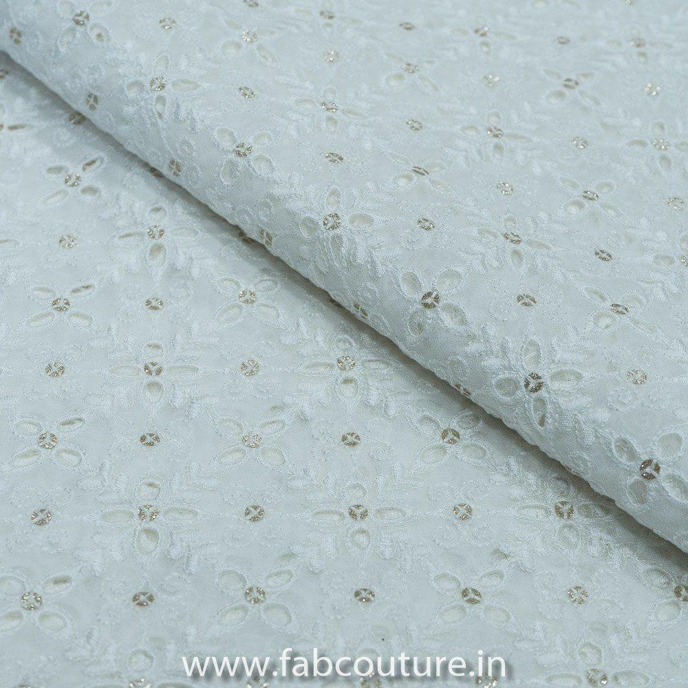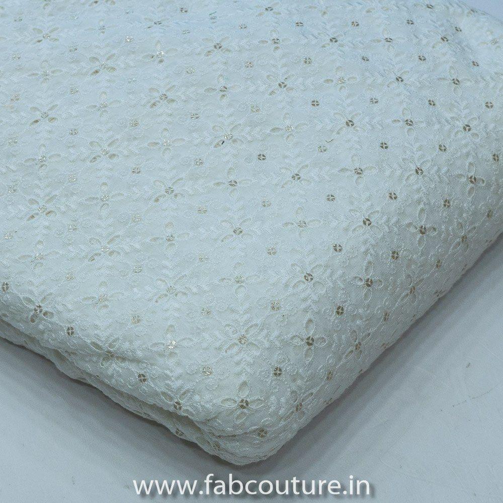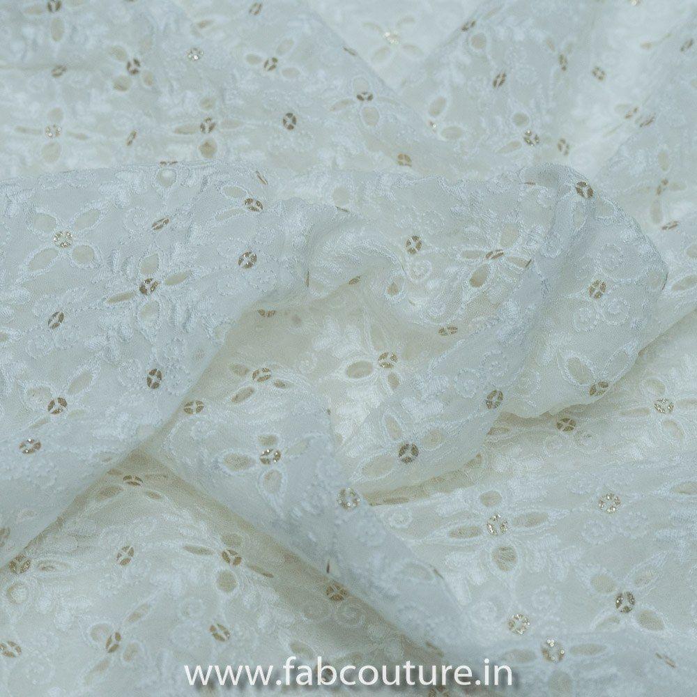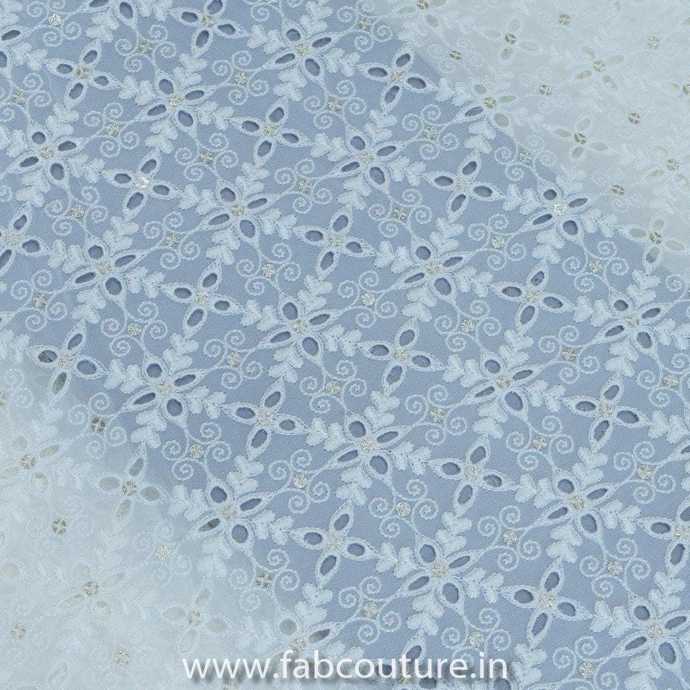 White Georgette Embroidery, Dyeable white georgette with cutwork design on the whole length of the fabric will make rich kurtas, shararas and plazzos. It will also be an interesting choice for a dupatta. SKU : 100202982, D.NO 38274