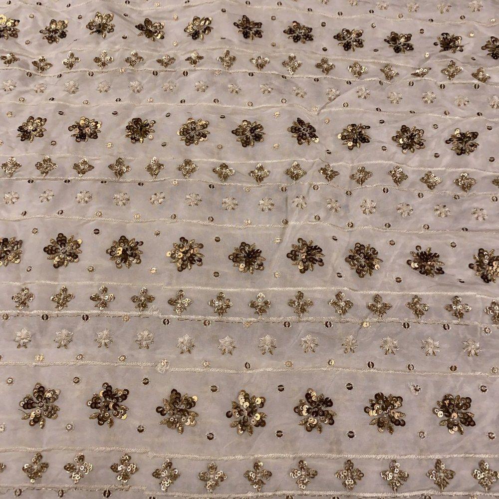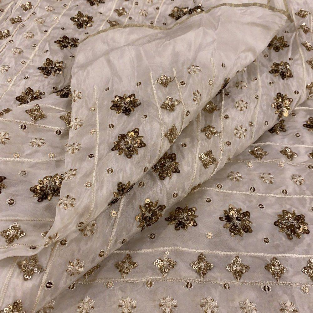 White Coloured Dyeable Uppada Embroidery, This Uppada embroidery can be dyed in any colour and the tiny flowers embellised in a mix of gold and silver in a stripes pattern makes it a beautiful fabric for kurtas and trousers. The Uppada sheen is just an add-on. SKU: 100204756