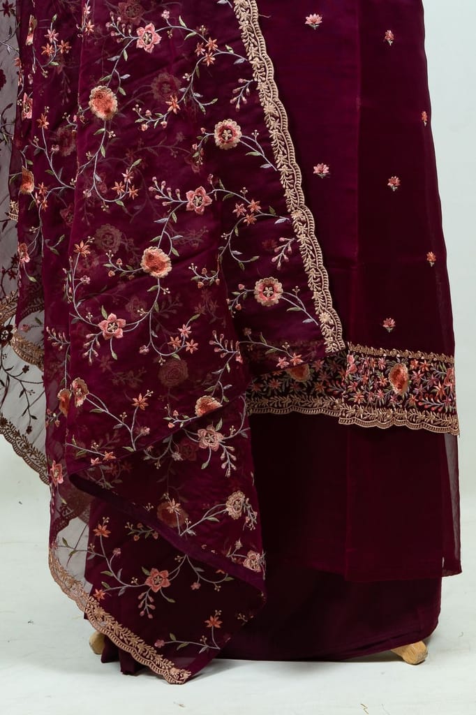 | Fabric Name | Wine Color Embroidered Viscose Organza Shirt with Bottom and Embroidered Viscose Organza Dupatta |
