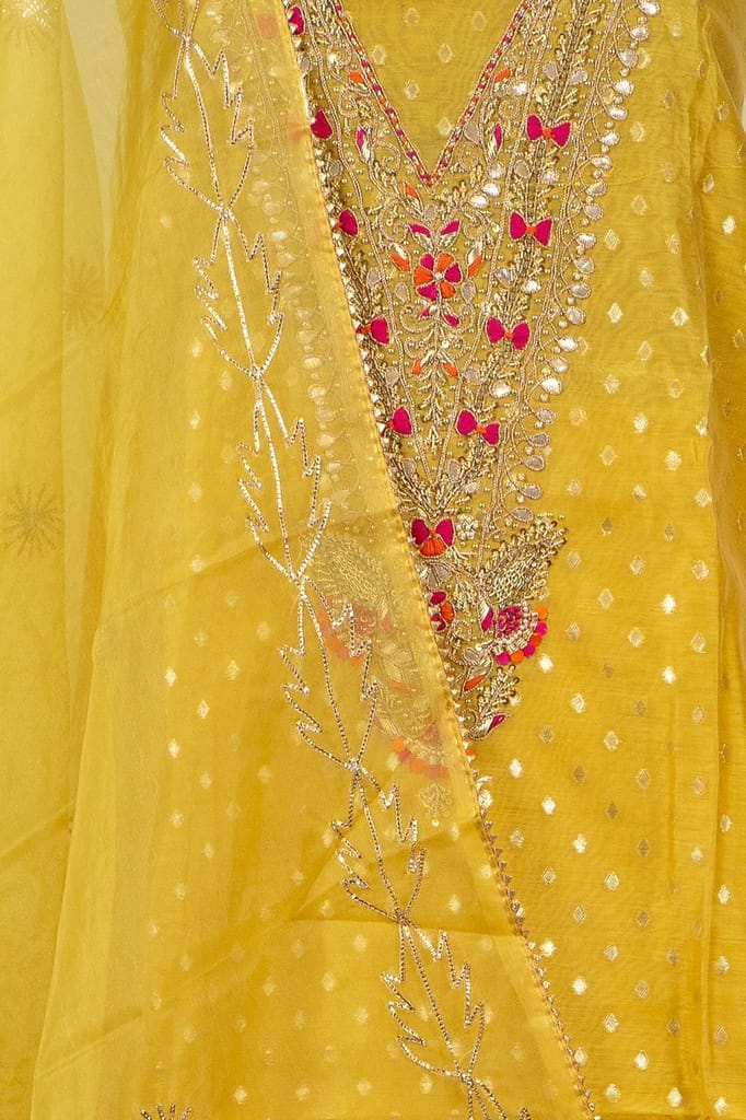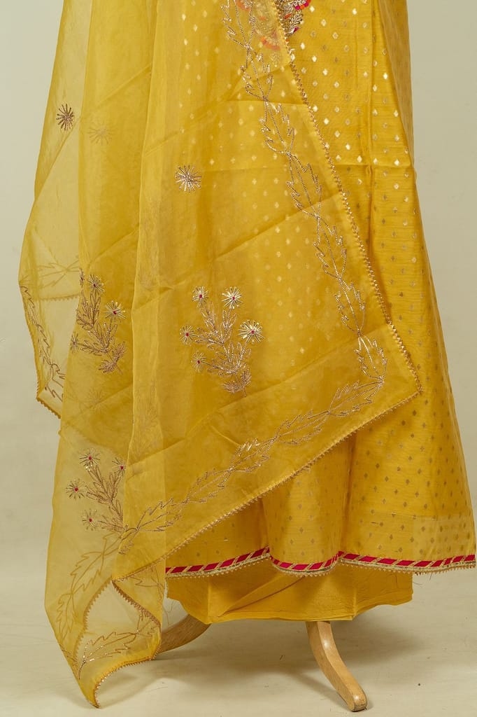 | Fabric Name | Yellow Color Chanderi Embroidered Shirt with Bottom and Organza Embroidered Dupatta |