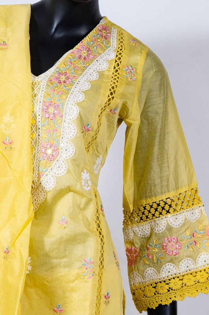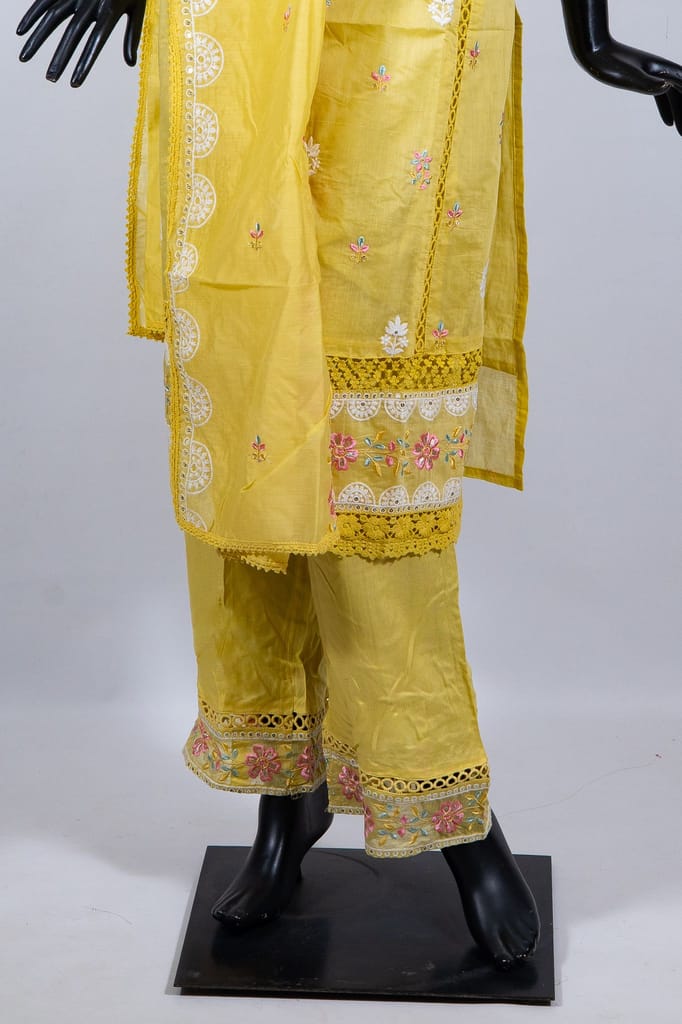| Fabric Name | Yellow Color Chanderi Embroidered Shirt with Rayon Embroidered Pant and Chanderi Embroidered Dupatta |