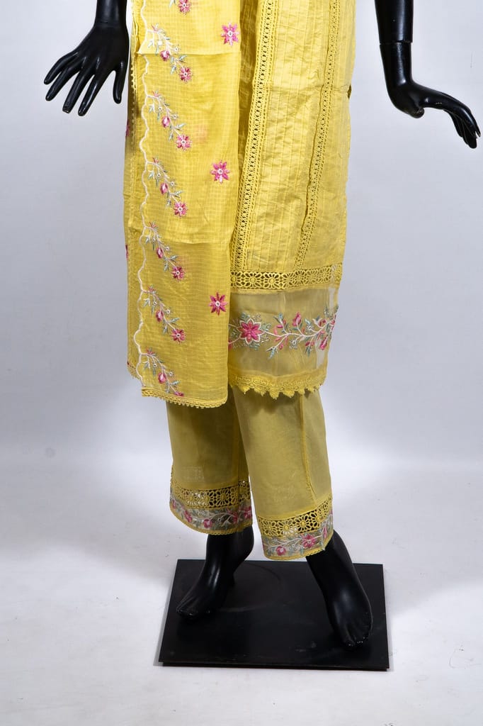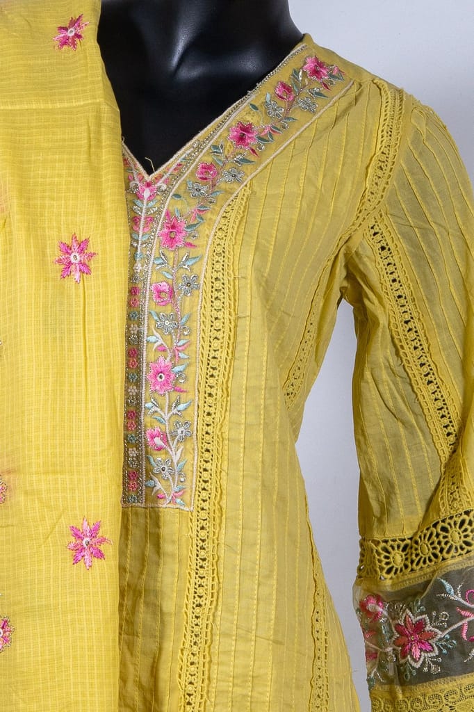 | Fabric Name | Yellow Color Cotton Embroidered Shirt with Cotton Embroidered Pant and Kota Doria Embroidered Dupatta |