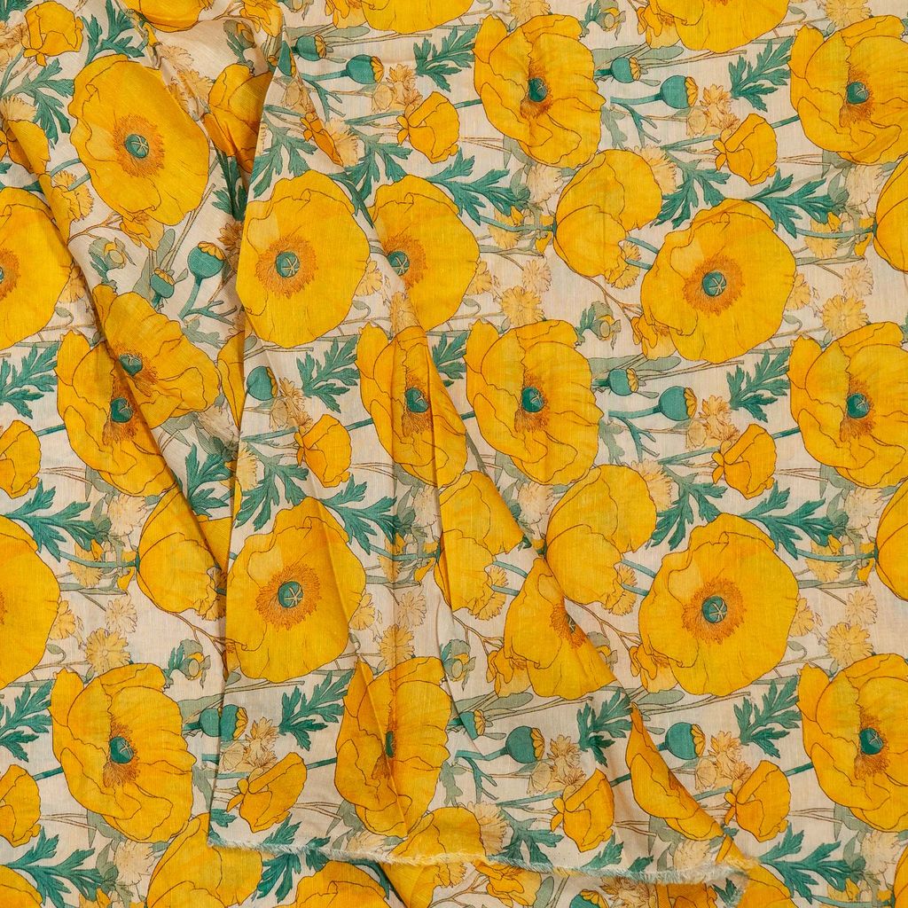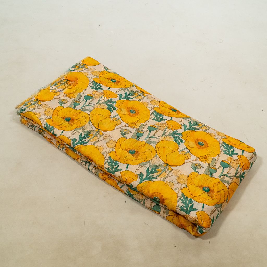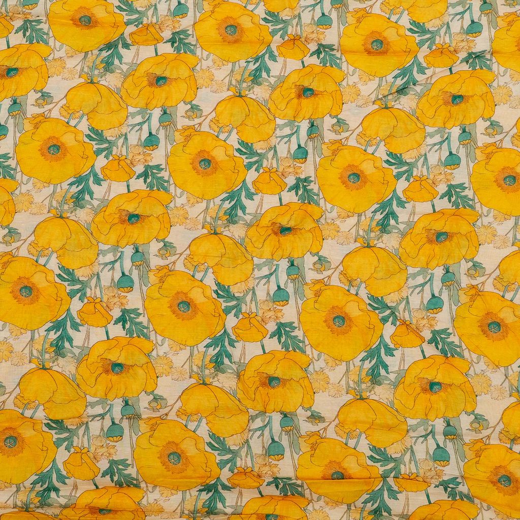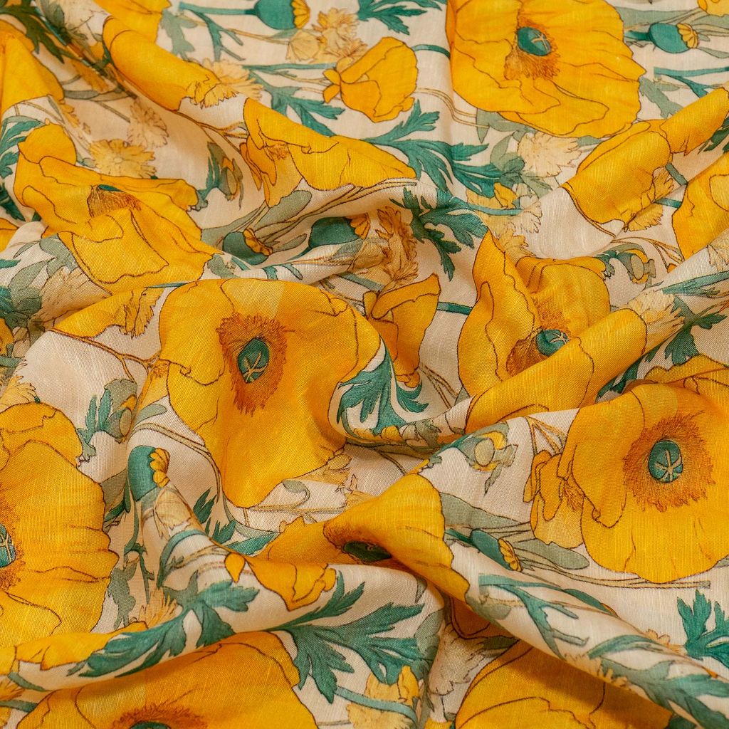 Add vibrant elegance to your collection with this Viscose Linen Digital Printed Fabric, featuring a striking botanical floral print inspired by poppy flowers. The design showcases large blooming yellow florals with leafy green stems arranged in an artistic botanical composition, creating a bold yet sophisticated look.