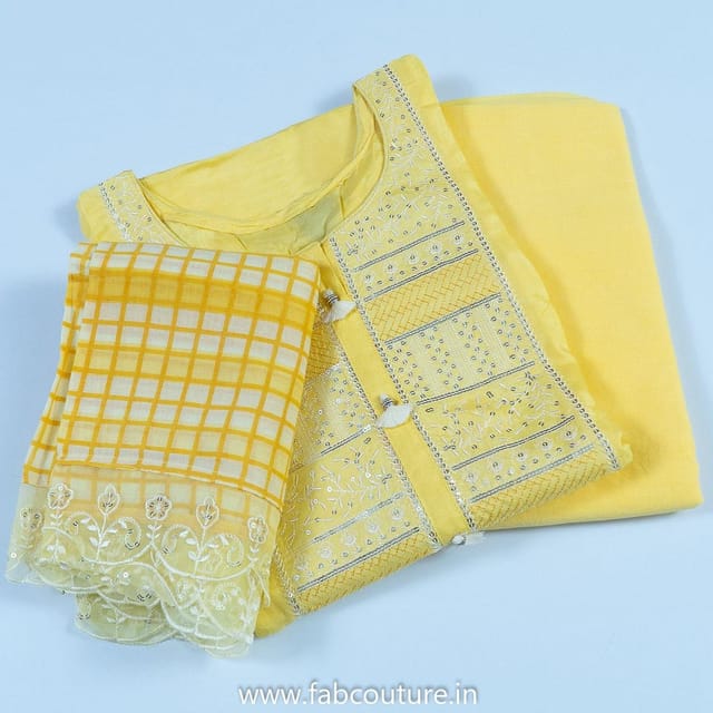 Muslin Embroidered Suit With Cotton Bottom And Muslin Printed Dupatta. This is from FabCouture UnStitched Suit Set Collection and the fabric is muslin with sequins embroidery on the yoke. The bottom is 2.5mtr cotton which can be stitched as per your choice into a plazzo, salwar, pajami or a trouser. The dupatta is in checks print muslin with a very pretty organza embroidered scallops border. It can be stitched upto size XL SKU:100211294 DNO-4796